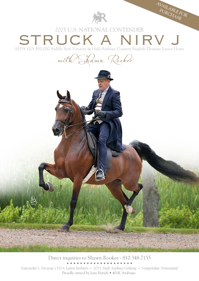“Baychelsea V has had 10 registered purebred foals,” says her owner Joni Hyrick. Of these, six qualify her as an Arabian Horse World Aristocrat Mare, and a seventh, Bay Chili V by Allience, has multiple reserve championships in country pleasure and hunt pleasure. She has produced champions by 4 different sires, two of them *Aladdinn sons, a third a son of one of those stallions, and three of them by Sundance Kid V, who is a grandson of Baychelsea’s sire Huckleberry Bey. All of her foals who have been campaigned have been at least reserve champions in performance and most have won regional and/or National titles.
